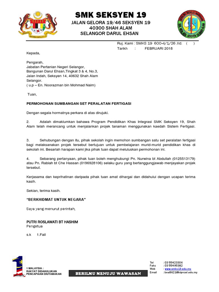 10 Contoh Surat Permohonan Bantuan Alat Barang Dana dan Lainnya. Bantuan bagi pembangunan infrastruktur seperti pemasangan sistem pengairan dan saliran serta pembinaan jalan ladang dengan kadar maksimum sebanyak RM20. Contoh surat rasmi permohonan bantuan peralatan sukan bola contoh surat.